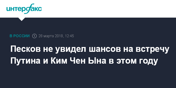 Москва. 28 марта. INTERFAX.RU - Возможность встречи президента России Владимира Путина с северокорейским лидером Ким Чен Ыном не обсуждается, сообщил пресс-секретарь президента РФ Дмитрий Песков.