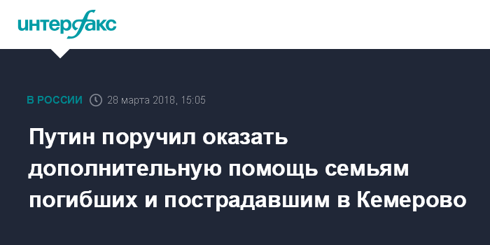 Москва. 28 марта. INTERFAX.RU - Президент РФ Владимир Путин поручил правительству оказать дополнительную помощь семьям погибших и пострадавшим от пожара в кемеровском торговом центре "Зимняя вишня".