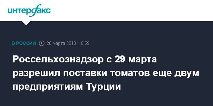 Москва. 28 марта. INTERFAX.RU - Россельхознадзор с 29 марта разрешил поставки томатов еще с двух предприятий Турции. Таким образом, общее число поставщиков увеличилось до 14.