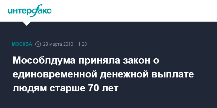 Москва. 29 марта. INTERFAX.RU - Мособлдума на заседании в четверг приняла в трех чтениях законопроект, предусматривающий предоставление единовременной денежной выплаты жителям Подмосковья в возрасте 70 лет и старше, передал корреспондент "Интерфакса".