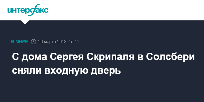 Москва. 29 марта. INTERFAX.RU - С дома экс-полковника ГРУ Сергея Скрипаля в британском Солсбери сняли входную дверь, сообщил в четверг телеканал Sky News, приводя кадры собственной аэросъемки.