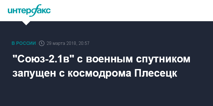 "Стартовавшая в 20:38 по московскому времени с космодрома Плесецк в Архангельской области ракета космического назначения "Союз-2.1в" в 20:41 по московскому времени принята на сопровождение наземными средствами Главного испытательного космического центра имени Титова Космических войск ВКС", - сообщили "Интерфаксу" в Департаменте информации и массовых коммуникаций Минобороны РФ.