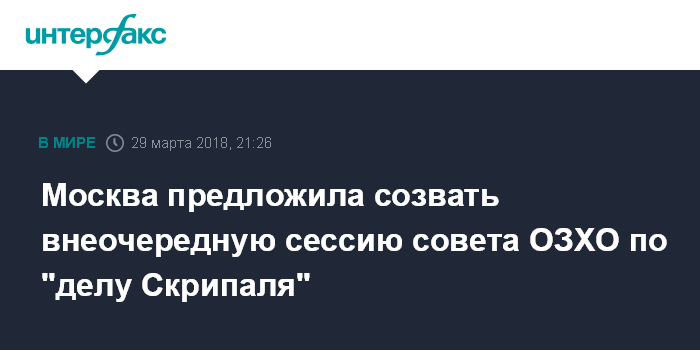Москва. 29 марта. INTERFAX.RU - Россия созывает 4 апреля сессию Исполнительного совета Организации по запрещению химического оружия (ОЗХО) для обсуждения "дела Скрипаля", сообщил глава МИД РФ Сергей Лавров.