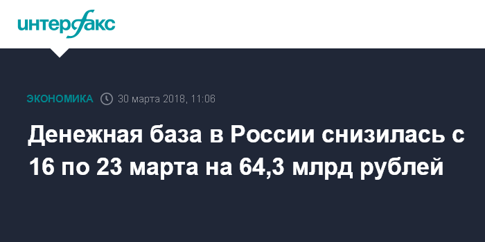 На 16 марта денежная база в России равнялась 9682,3 млрд рублей. Таким образом, за период она снизилась на 0,66%, или на 64,3 млрд рублей.