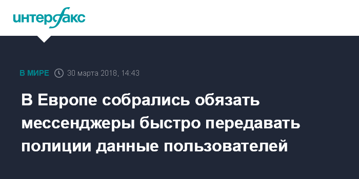Москва. 30 марта. INTERFAX.RU - Еврокомиссия добивается, чтобы мобильные приложения мессенджеров и другие цифровые службы коммуникаций были обязаны предоставлять полиции данные пользователей в течение десяти дней с момента запроса, а в срочных случаях - в течение шести часов, сообщает электронное издание Euractiv.