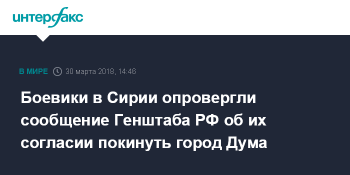 Москва. 30 марта. INTERFAX.RU - Боевики из группировки "Джейш аль-Ислам" заявили, что не давали согласие на то, чтобы покинуть город Дума в Восточной Гуте, сообщает в пятницу агентство Associated Press.