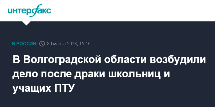 Москва. 30 марта. INTERFAX.RU - Сотрудники полиции в Волгоградской области возбудили уголовное дело в отношении одной из участниц драки девочек-подростков в городе Суровикино, видеозапись которой попала в интернет. Об этом сообщила агентству "Интерфакс" руководитель пресс-службы регионального главка МВД Светлана Смольянинова в пятницу.
