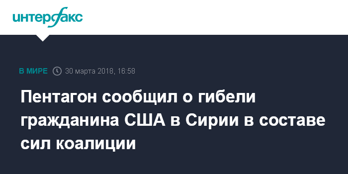 Москва. 30 марта. INTERFAX.RU - Пентагон сообщил, что в результате подрыва самодельного взрывного устройства в Сирии погиб гражданин США, национальность второго погибшего не уточняется.