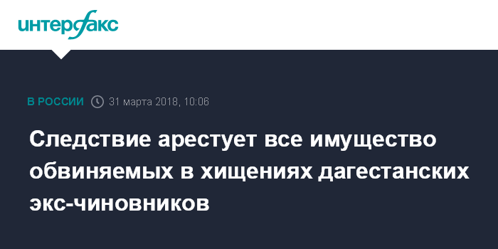 Москва. 31 марта. INTERFAX.RU - Имущество обвиняемых в крупных хищениях бывших высокопоставленных чиновников Дагестана и членов их семей в ближайшее время будет арестовано, сообщил "Интерфаксу" в субботу информированный источник.