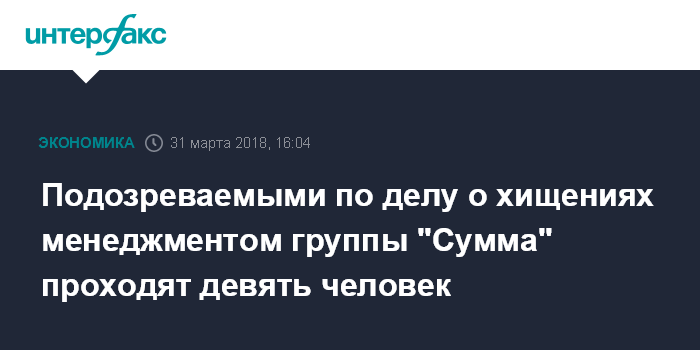 Москва. 31 марта. INTERFAX.RU - Девять человек проходят подозреваемыми по уголовному делу об организации менеджментом группы "Сумма" преступного сообщества и крупных денежных хищениях, сообщил "Интерфаксу" в субботу информированный источник.