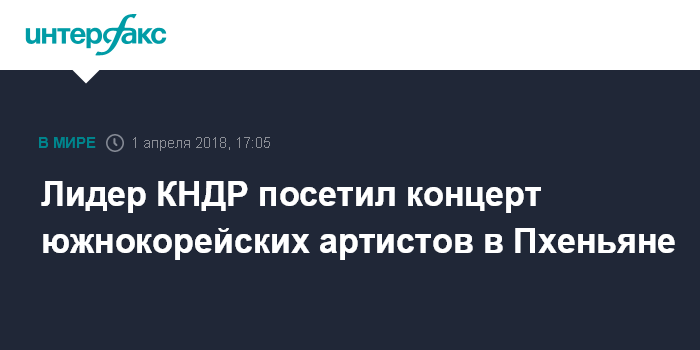 Москва. 1 апреля. INTERFAX.RU - Лидер КНДР Ким Чен Ын с супругой в воскресенье присутствовали на концерте в Пхеньяне, который давали артисты из Южной Кореи, сообщили южнокорейские СМИ, цитируя главу делегации из Сеула - министра культуры Республики Корея До Чон Гвана.