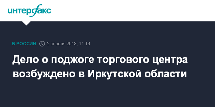 Москва. 2 апреля. INTERFAX.RU - Уголовное дело возбуждено после поджога ТЦ "Центр" в Ангарске (Иркутская область), сообщили в понедельник в пресс-службе Следственного управления СКР по региону.