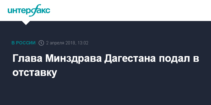 Москва. 2 апреля. INTERFAX.RU - Министр здравоохранения республики Дагестан Танка Ибрагимов написал заявление об отставке, сообщил агентству "Интерфакс" информированный источник.