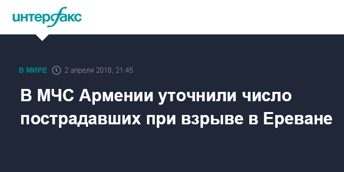 Москва. 2 апреля. INTERFAX.RU - По уточненным данным, восемь человек пострадали в результате взрыва в ресторане "Бургер Кинг" на Северном проспекте в центре Еревана.