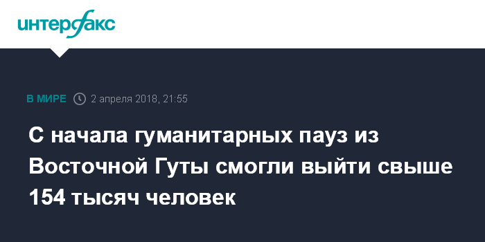 Москва. 2 апреля. INTERFAX.RU - Более 154 тысяч человек смогли выйти по гуманитарным коридорам из Восточной Гуты, заявляют российские военные.