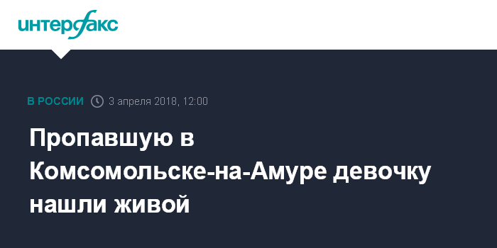 Москва. 3 апреля. INTERFAX.RU - Шестилетняя девочка, поиски которой вели полицейские и волонтеры в Комсомольске-на-Амуре, найдена живой, сообщает СУ СКР по Хабаровскому краю во вторник.