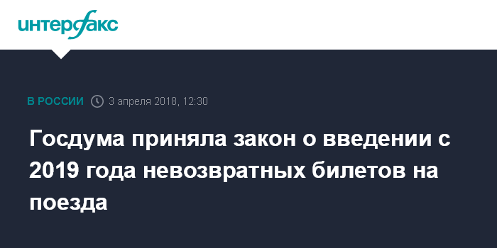 Москва. 3 апреля. INTERFAX.RU - Депутаты Государственной Думы приняли во вторник в третьем, окончательном чтении закон о введении так называемых невозвратных билетов на поезда дальнего следования.