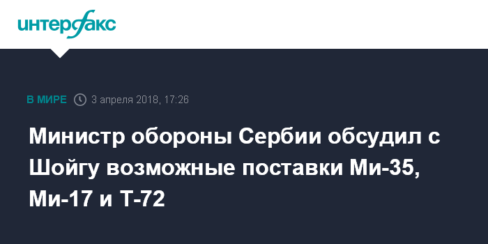 Москва. 3 апреля. INTERFAX.RU - Вопрос поставки в Сербию четырёх боевых вертолётов Ми-35, четырёх транспортных вертолётов Ми-17, танков Т-72, боевых машин пехоты БМП-2 и другого вооружения обсуждался в ходе переговоров с министром обороны России Сергеем Шойгу, сообщил журналистам во вторник глава военного ведомства Сербии Александр Вулин.