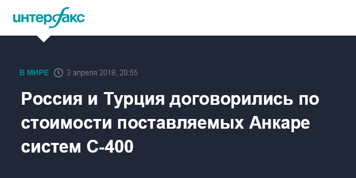 Москва. 3 апреля. INTERFAX.RU - Россия ускорила производство зенитных ракетных систем С-400 для Турции по просьбе Анкары, и стороны договорились по цене, заявил президент РФ Владимир Путин.