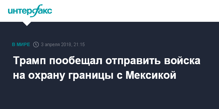 Москва. 3 апреля. INTERFAX.RU - Президент США Дональд Трамп заявил, что планирует направить американские войска для охраны границы с Мексикой, передают во вторник американские СМИ.