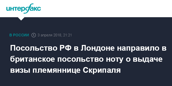 Москва. 3 апреля. INTERFAX.RU - Посольство РФ в Великобритании сообщило во вторник, что направило в британское посольство ноту с просьбой о выдаче визы племяннице Сергея Скрипаля.