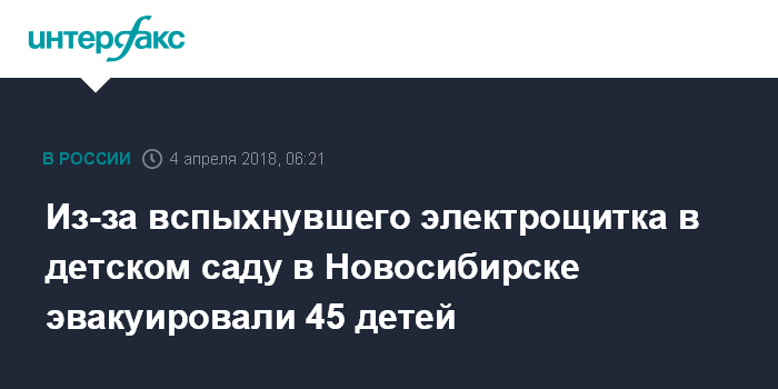 Москва. 4 апреля. INTERFAX.RU - Возгорание в электрощитовой детского сада в Ленинском районе Новосибирска произошло утром в среду, из здания было эвакуировано 45 детей и девять сотрудников детсада, сообщили "Интерфаксу" в ГУ МЧС России по региону.