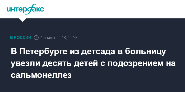 Москва. 4 апреля. INTERFAX.RU - Из детского сада в Петербурге с подозрением на сальмонеллез госпитализировали 10 воспитанников.