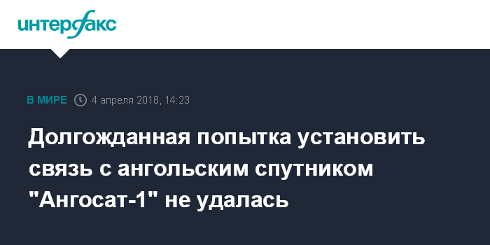 Москва. 4 апреля. INTERFAX.RU - Первый ангольский спутник "Ангосат-1" не подает признаков жизни четыре месяца, долгожданная попытка установить связь с аппаратом в зоне радиовидимости оказалась безуспешной, сообщил "Интерфаксу" источник в ракетно-космической отрасли.