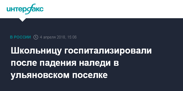 Москва. 4 апреля. INTERFAX.RU - Десятилетняя девочка получила травму в результате падения на нее снежной наледи с крыши жилого дома в поселке Октябрьский Ульяновской области.