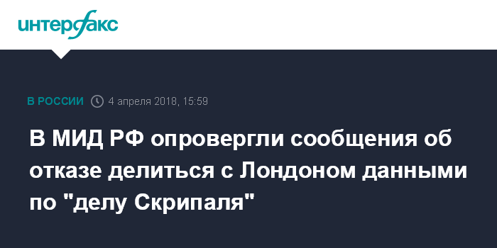 Москва. 4 апреля. INTERFAX.RU - Москва готова к предметной работе с Лондоном по "делу Скрипаля", сообщения о том, что Россия отказывается делиться с Великобританией информацией по этому делу, не соответствуют реальности, заявила официальный представитель МИД РФ Мария Захарова.