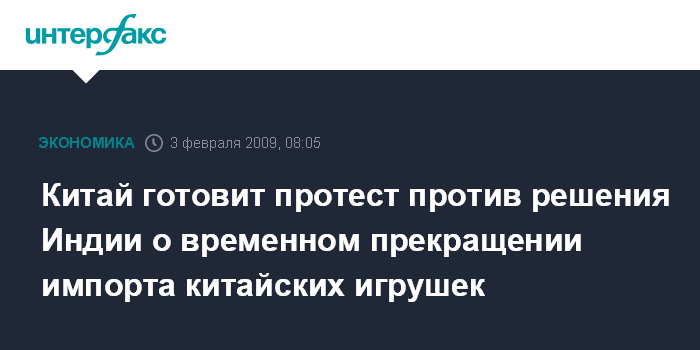 Москва. 3 февраля. INTERFAX.RU - Китайское правительство в ближайшее время намерено заявить решительный протест Индии в связи с принятым ею решением о прекращении на шесть месяцев импорта игрушек из Китая, заявил представитель министерства коммерции КНР.