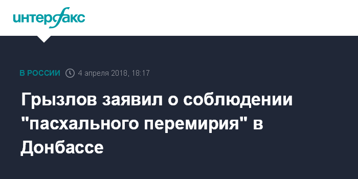 "На сегодняшней встрече Контактной группы были проанализированы промежуточные результаты "пасхального перемирия", действующего с 30 марта. Специальная мониторинговая миссия ОБСЕ констатировала, что на большинстве участков линии разграничения обстрелы не зафиксированы, из чего следует, что действующий режим прекращения огня - это серьезный вклад в общее дело по обеспечению безопасности жителей районов конфликтной зоны", - сказал Грызлов журналистам в среду.