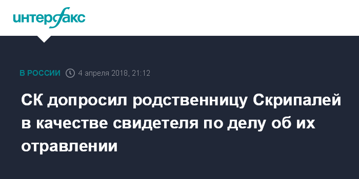 "Сегодня мы были в Следственном комитете, где я дала показания в качестве свидетеля по делу о покушении на убийство гражданки России (Юлии Скрипаль - ИФ)", - сказала Скрипаль, отвечая на соответствующий вопрос "Интерфакса".