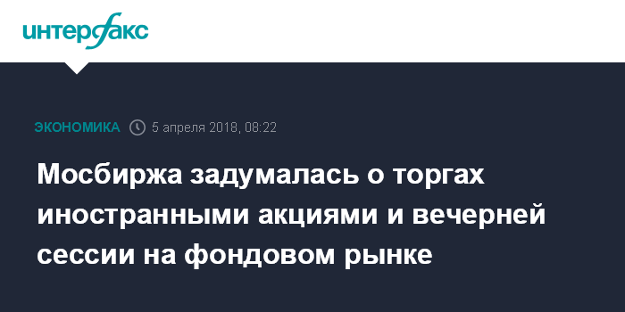 Москва. 5 апреля. INTERFAX.RU - Московская биржа планирует запустить торги иностранными акциями и ввести вечернюю сессию на фондовом рынке до 23:50 по московскому времени. Эти предложения представители организатора торгов озвучили на заседании комитета по фондовому рынку во вторник, сообщили "Интерфаксу" несколько участников комитета.