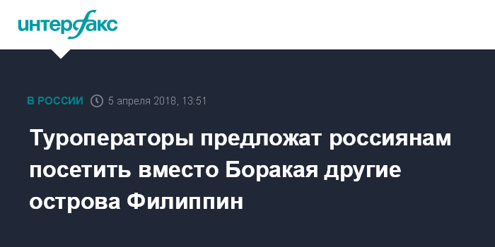 Москва. 5 апреля. INTERFAX.RU - Российские туроператоры предложат своим клиентам, которые планировали поездки на остров Боракай на Филиппинах, другие острова архипелага либо возврат денег, сообщила "Интерфаксу" в четверг пресс-секретарь Российского союза туриндустрии (РСТ) Ирина Тюрина.