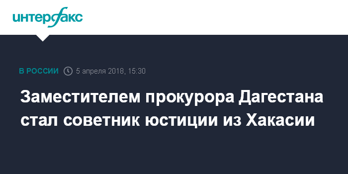 "Приказом Генерального прокурора Российской Федерации от 5 апреля старший советник юстиции Ежов Алексей Владимирович назначен на должность заместителя прокурора Республики Дагестан и освобожден от должности прокурора г. Абакана Республики Хакасия", - говорится в сообщении
