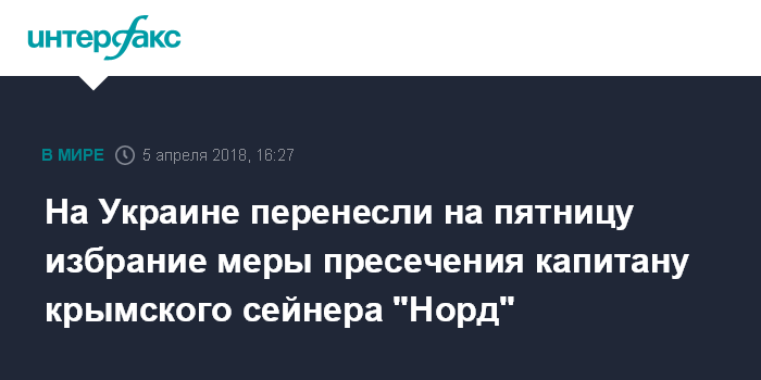 Москва. 5 апреля. INTERFAX.RU - Суд в украинском Херсоне в четверг перенес на 6 апреля заседание по избранию меры пресечения капитану крымского рыболовецкого судна "Норд" Владимиру Горбенко, задержанному погранслужбой Украины полторы недели назад в Азовском море.