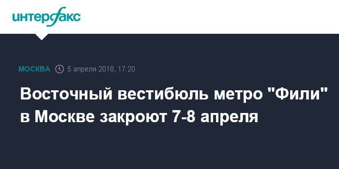 "В ближайшие выходные, 7 и 8 апреля, будет закрыт восточный вестибюль станции "Фили" Филевской линии. Для входа в метро и выхода в город пассажиры смогут воспользоваться западным вестибюлем станции. В обычном режиме станция возобновит работу в понедельник, 9 апреля, в 5:30 утра",- сообщили " Интерфаксу"'в пресс-службе метрополитена.