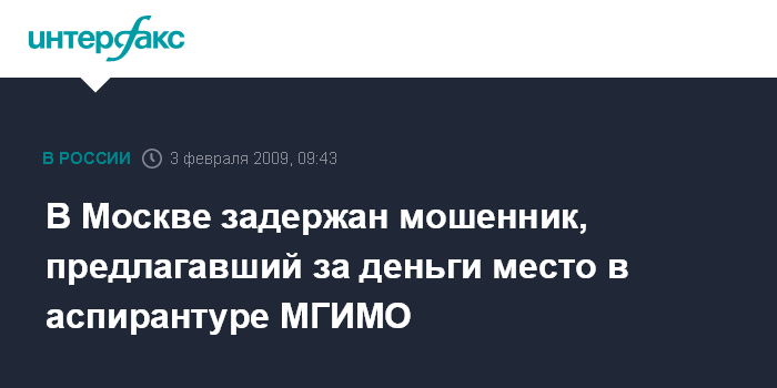 "Кандидат в аспиранты под контролем сотрудников милиции вступил в переговоры с продававшим место в аспирантуре, в ходе переговоров сумму взятки удалось снизить до 40 тыс. евро. Во время передачи денег в одном из ресторанов рядом со зданием МИД РФ "продавец" был задержан. Им оказался москвич Роман Популиди. Как выяснилось, он не был аспирантом МГИМО и никакого отношения к институту не имел", - сказал собеседник агентства. В отношении задержанного было возбуждено уголовного дело по ч 3. ст. 159 УК РФ ("мошенничество в крупных размерах").