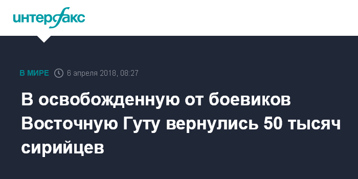 Москва. 6 апреля. INTERFAX.RU - Более 50 тысяч жителей вернулись в освобожденные от боевиков районы Восточной Гуты, сообщили в Минобороны РФ.