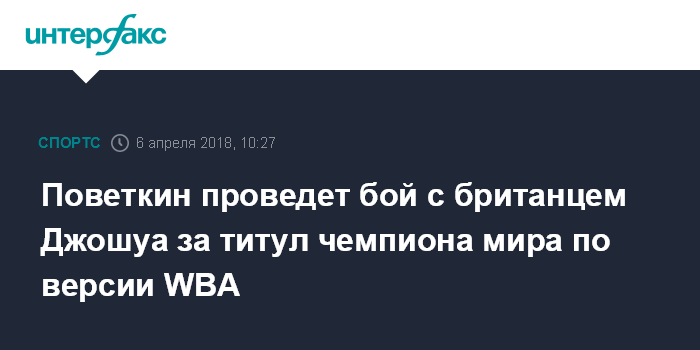 Москва. 6 апреля. INTERFAX.RU - Российский боксер Александр Поветкин проведет бой за титул чемпиона мира по версии Всемирной боксерской ассоциации (WBA) с его нынешним обладателем британцем Энтони Джонуа, сообщил промоутер Андрей Рябинский в своем твиттере в пятницу.