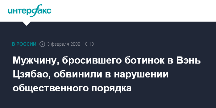 Москва. 3 февраля. INTERFAX.RU - Мужчине, кинувшему ботинок в премьера Госсовета КНР Вэнь Цзябао во время его выступления в Кембриджском университете, предъявлено обвинение в нарушении общественного порядка, сообщает во вторник ВВС.
