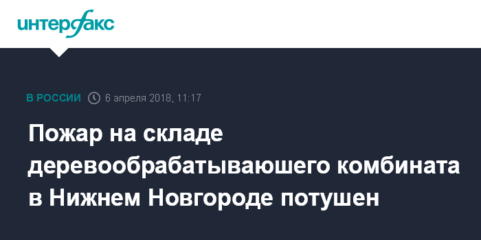 Москва. 6 апреля. INTERFAX.RU - Пожарные ликвидировали крупное возгорание на складе деревообрабатывающего комбината в Канавинском районе Нижнего Новгорода, сообщается на сайте ГУ МЧС РФ по Нижегородской области.