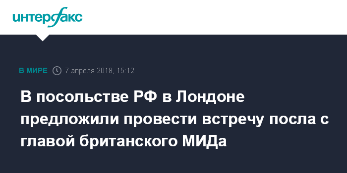 Москва. 7 апреля. INTERFAX.RU - В посольстве РФ в Лондоне высказались за проведение встречи посла Александра Яковенко с министром иностранных дел Великобритании Борисом Джонсоном в свете расследования "дела Скрипалей".