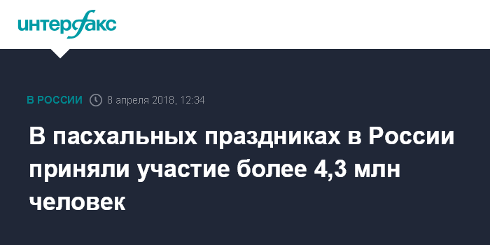 Москва. 8 апреля. INTERFAX.RU - Свыше 4,3 млн человек более чем в 7,4 тыс. населенных пунктов приняли участие в пасхальных мероприятиях, сообщила "Интерфаксу" в воскресенье официальный представитель МВД России Ирина Волк.