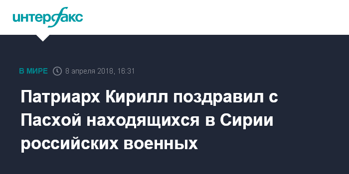 Москва. 8 апреля. INTERFAX.RU - Патриарх Московский и всея Руси Кирилл в воскресенье поздравил по видеосвязи российских военнослужащих на авиабазе Хмеймим в Сирии с праздником Пасхи.