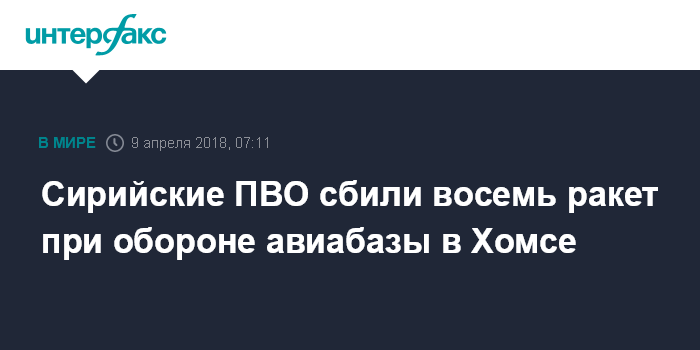 Москва. 9 апреля. INTERFAX.RU - Силы противовоздушной обороны Сирии сбили восемь ракет противника при ракетном обстреле авиабазы "Тийфор" (Т-4) правительственных ВВС в сирийской провинции Хомс, сообщило сирийское государственное телевидение.