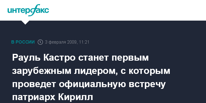 Москва. 3 февраля. INTERFAX.RU - Патриарх Московский и всея Руси Кирилл встретится во вторник в Москве с председателем Госсовета и Совета министров Кубы Раулем Кастро.