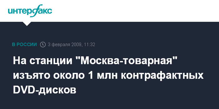 Москва. 3 февраля. INTERFAX.RU - Сотрудники Московского УВД на железнодорожном транспорте изъяли партию контрафактных DVD-дисков и обложек к ним на сумму около 120 млн рублей.