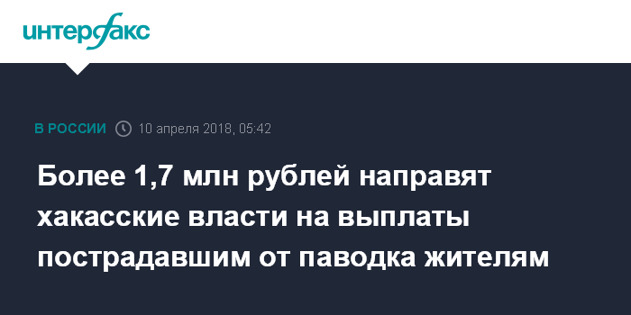 "Министерством финансов Хакасии направлены денежные средства на выплату единовременной материальной помощи пострадавшим от подтоплений талыми водами. Общая сумма выплат составляет 1 млн 710 тысяч рублей", - говорится в сообщении.